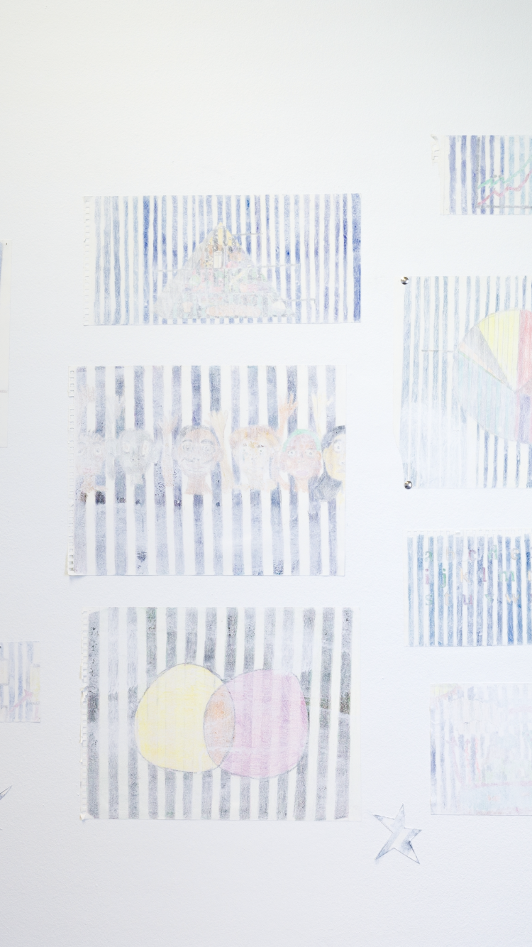 Standardized neutral color-grading studio latex paint (Munsell N7), floor sealing wax, stickers, poster board.